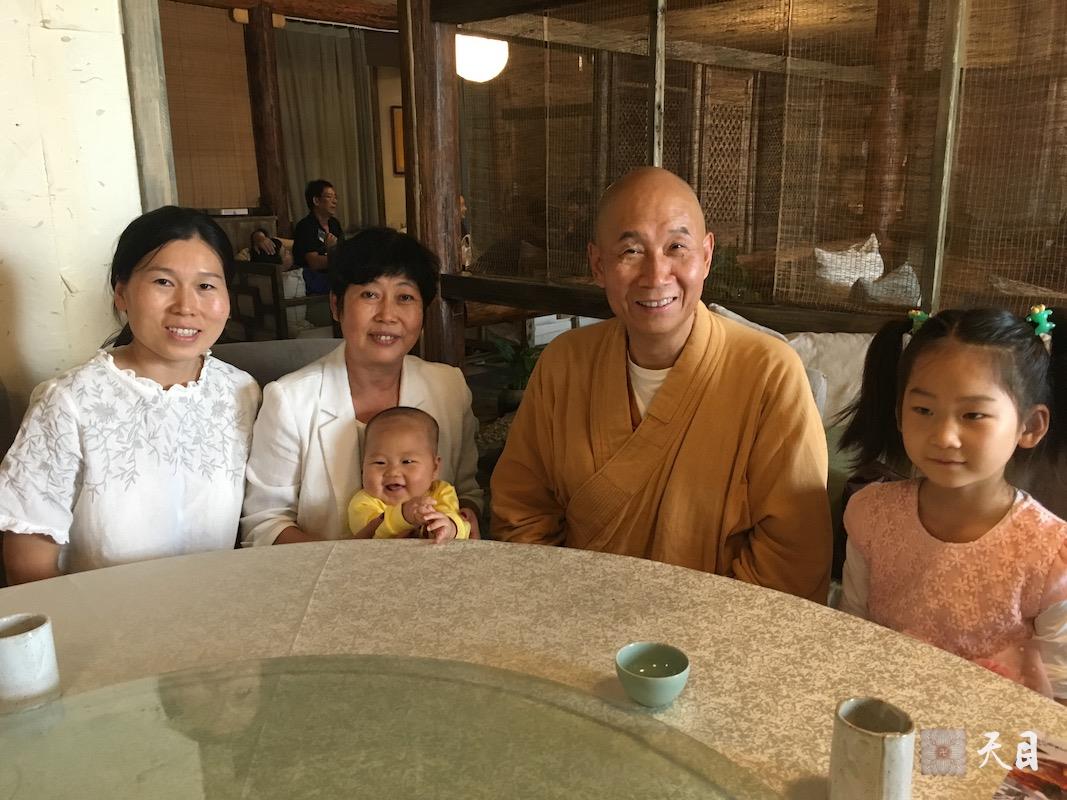 图一:恩师圣观法师和常好居士及一位妈妈及其两小信众在西安素心茶房素食馆合影;