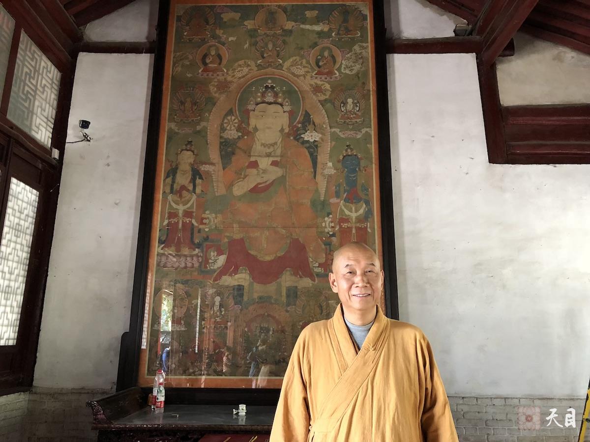 图为恩师圣观法师在西安大兴善寺的弥勒菩萨巨幅唐卡前留影,并给弟子们介绍此幅唐卡是老唐卡的来历。康熙在位三十六年时为其母祝寿,西藏活佛给赠送了此弥勒菩萨巨幅唐卡。到了文革破四旧期间,此弥勒菩萨巨幅唐卡在广元寺也差点惨遭销毁,只是碰上一些尚有良知的红卫兵把它悄悄送去了大兴善寺因此而躲过了一劫,并被大兴善寺保留至今。