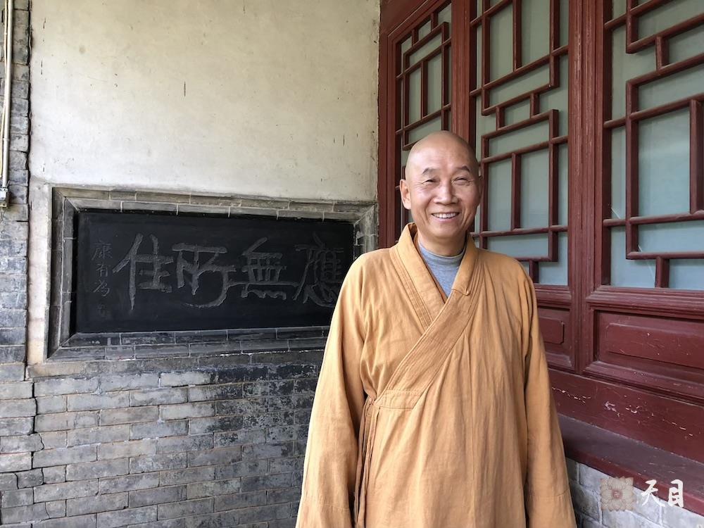 图一:恩师圣观法师在西安大兴善寺法堂前西侧康有为 “应无所住” 的墨迹刻石墙壁前留影;