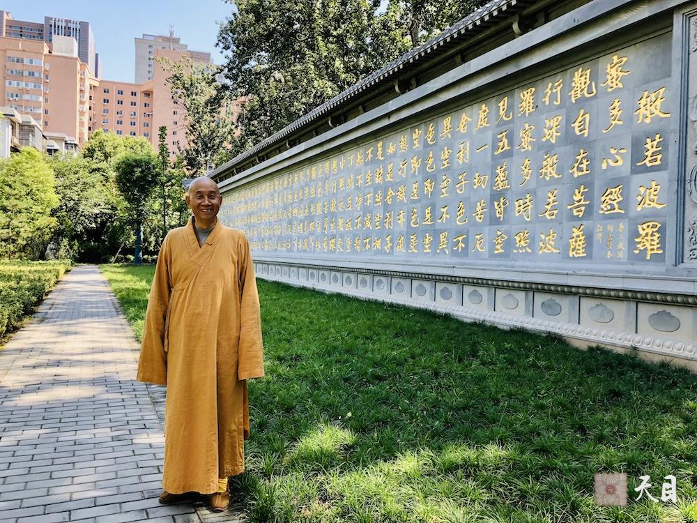 图一:恩师圣观法师在西安大兴善寺《般若波罗蜜多心经》照壁前留影;
