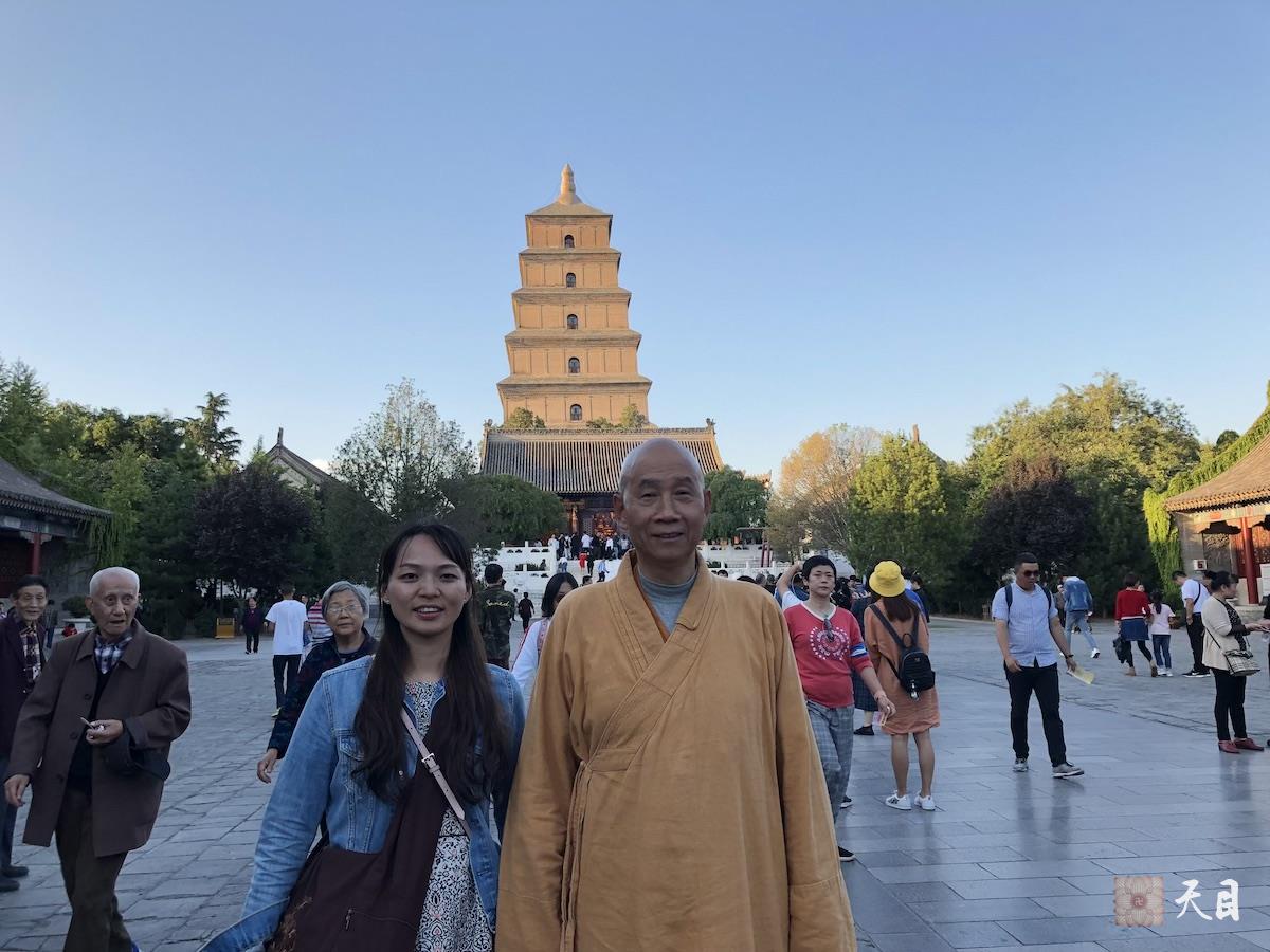 图为恩师圣观法师和常云居士在西安大慈恩寺大雁塔前合影。