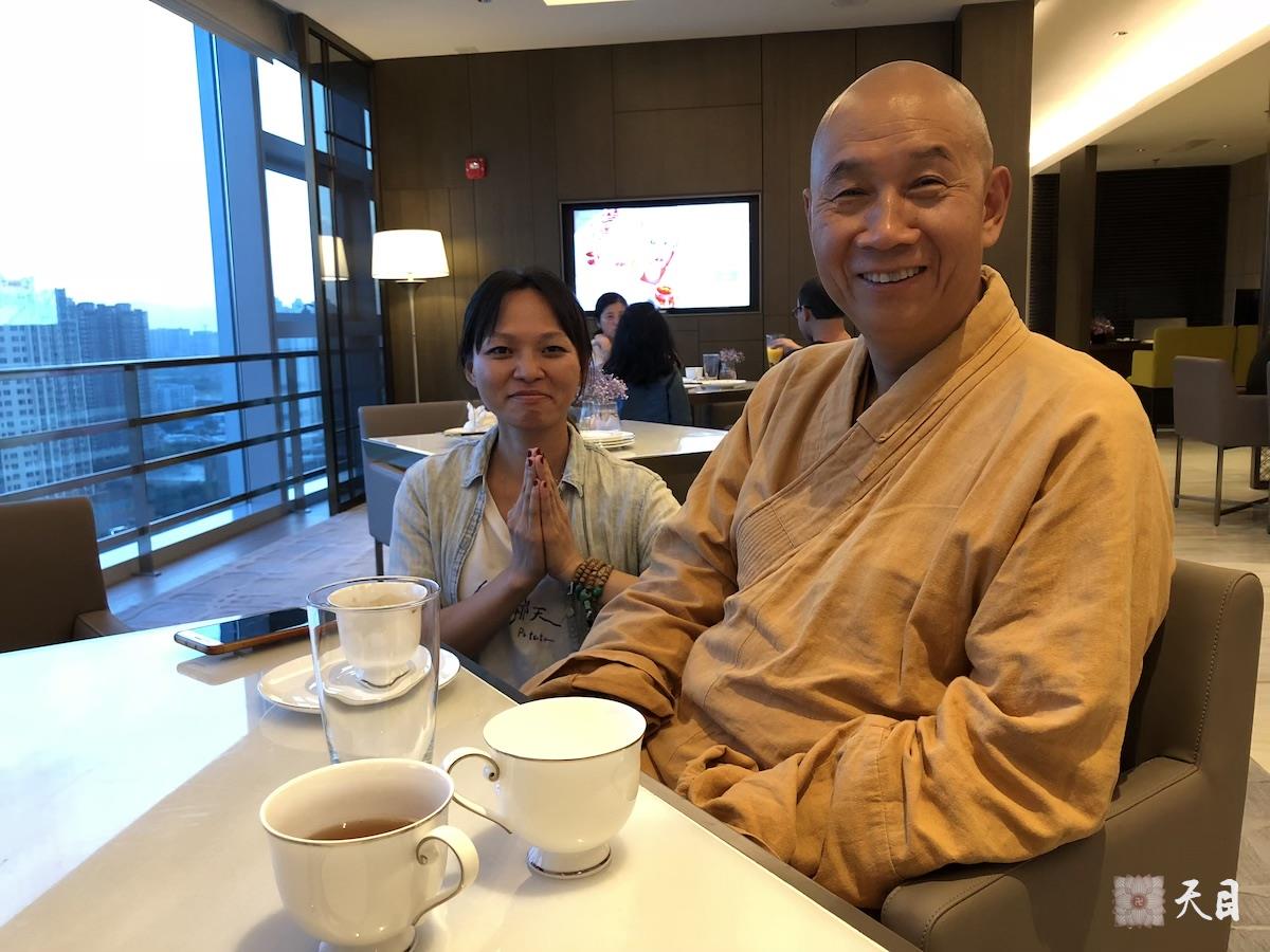 图二:恩师圣观法师和美儒居士在西安蓝海风万怡酒店行政酒廊晚餐合影。