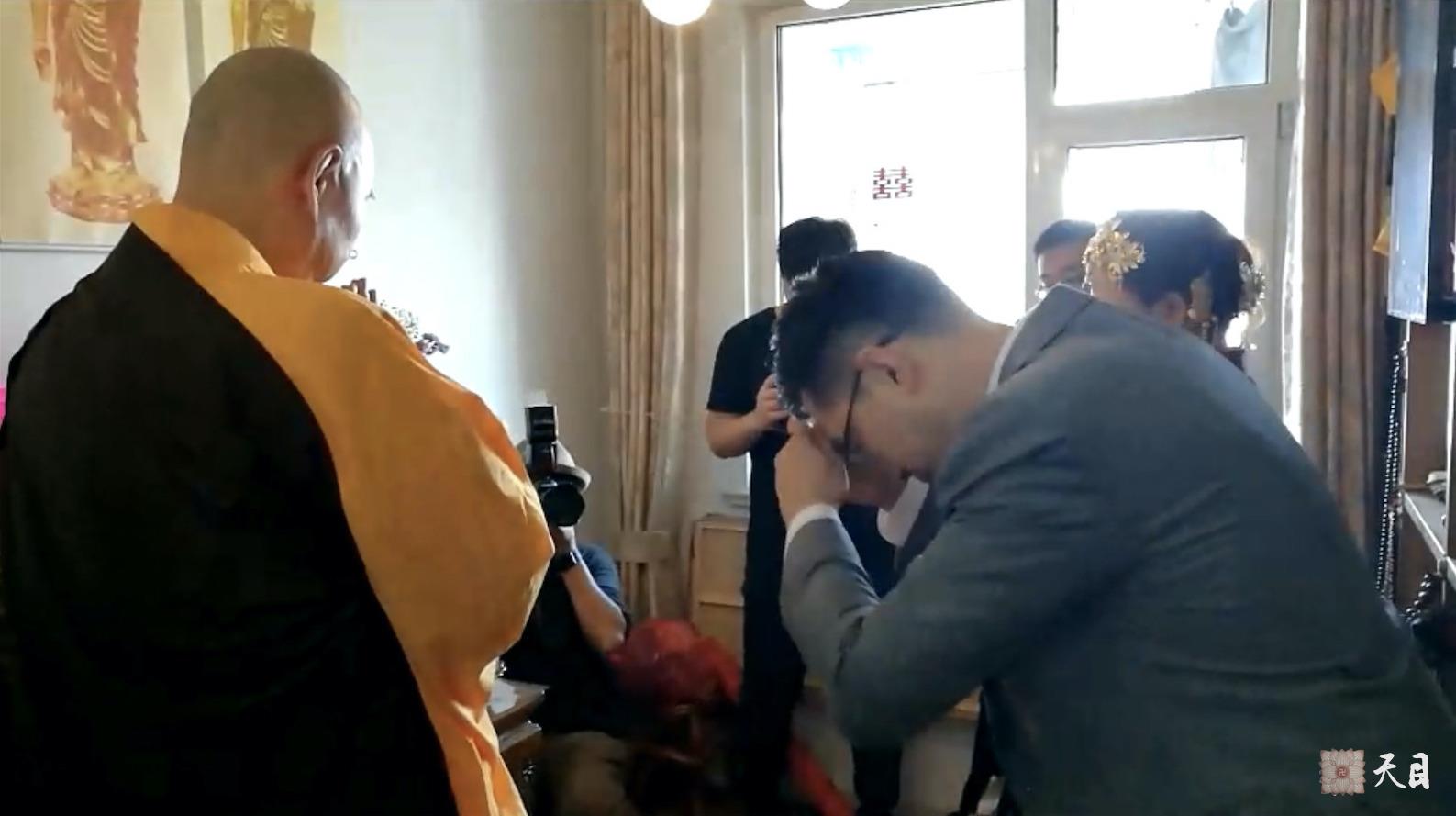 图一至图四:恩师圣观法师唱诵大悲咒引领张译文于文虔居士夫礼佛;