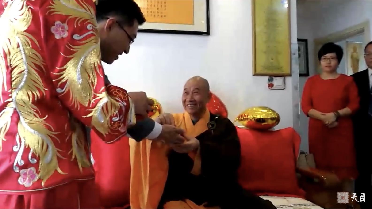 “2018年10月2日,恩师圣观法师在陕西省人民医院高干病房住院十一天后出院,应常心法师的俗家女儿张译文居士的礼请供养将在次日前往青岛入住青岛李沧绿城喜来登酒店,于10月4日在李四光故居地质之光展览馆出席张译文居士和于文虔居士的婚礼。恩师圣观法师慈悲,在果实法师等弟子的护持下出院,专程回到西安佛堂请下西藏拉萨雪堆白唐卡老板常明居士供养的释尊唐卡,准备带到青岛结缘给张译文居士做结婚礼物。