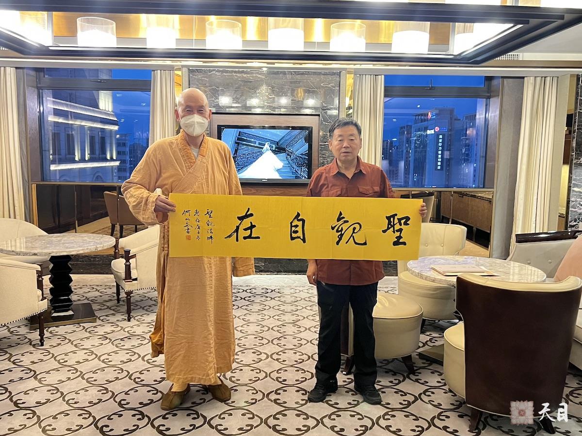2023年9月6日,恩师圣观法师与何炳武教授相聚在西安赛瑞喜来登,接受何炳武教授在2020年冬为恩师圣观法师祈福所作的 “圣观自在” 书法。
