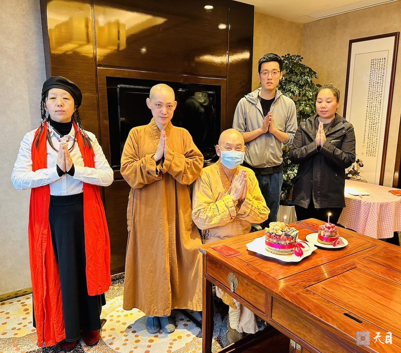 图为恩师圣观法师加持果实法师的生日和果实法师、常金居士、常静居士、姚晓红合影。