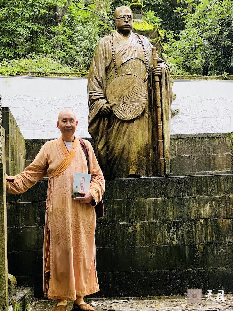 图一:2024年6月16月恩师圣观法师参访缙云寺瞻仰太虚大师塔在太虚大师铜像前留影;