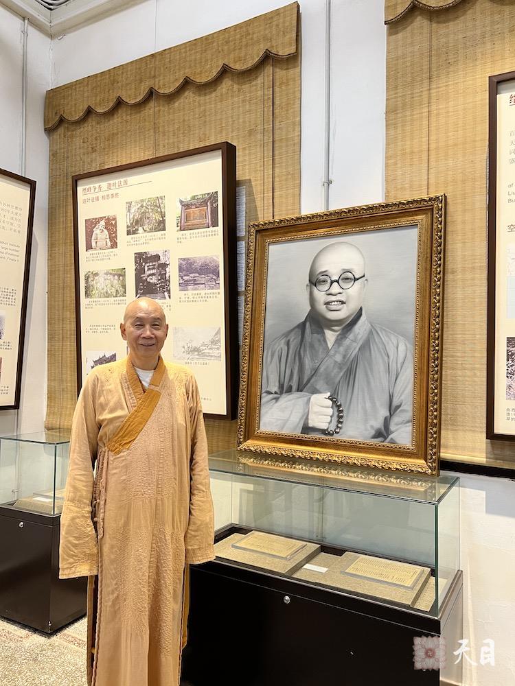 图为恩师圣观法师在缙云寺陈列馆太虚大师画像前留影。