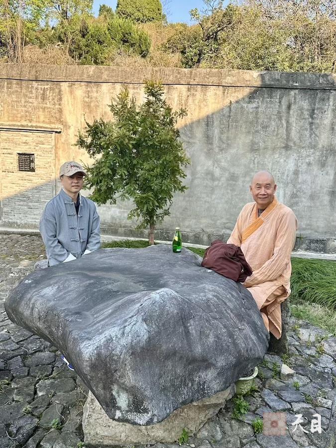 图为恩师圣观法师在宝严寺晚晴院门外坐石凳上给常海居士开示。