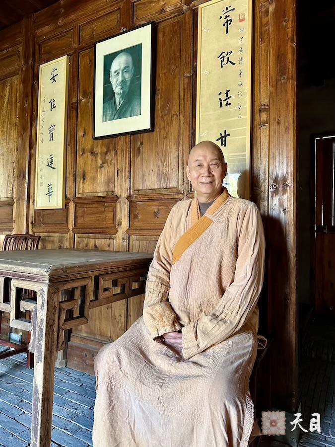图为恩师圣观法师在宝严寺晚晴院弘一法师画像前留影。
