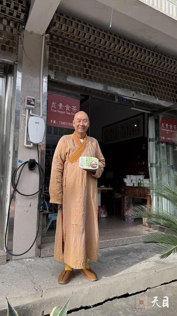 图一、二:恩师圣观法师在温州贞素食茶茶馆瑶溪店门前留影;