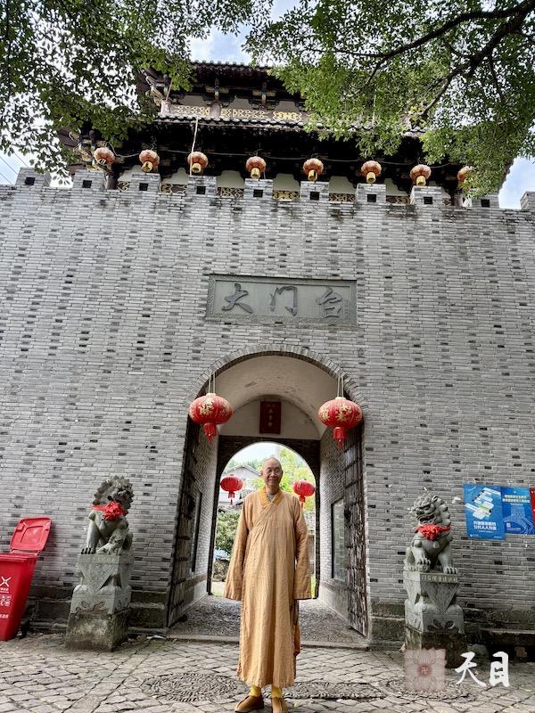 图一:恩师圣观法师在温州永嘉枫林徐定超纪念馆大门台村的大门台前留影;步入大门台村的念祖桥,映入你眼帘的是一座高大的大门台。右拐100余米,便是徐定超御史祠。