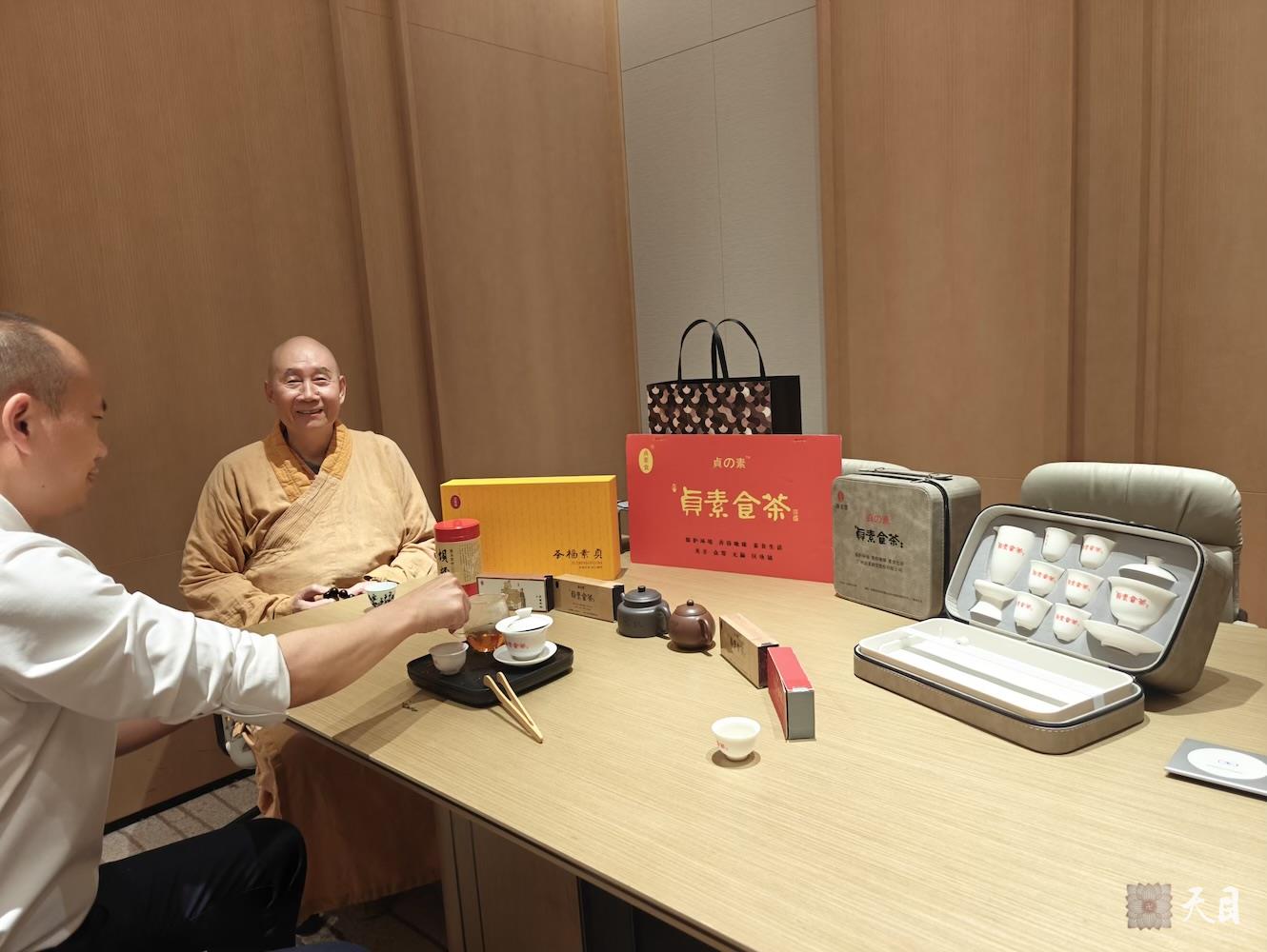 图一:恩师圣观法师在东莞万豪行政酒廊会议室给常红居士、常扬居士开示加持其贞素食茶茶馆;