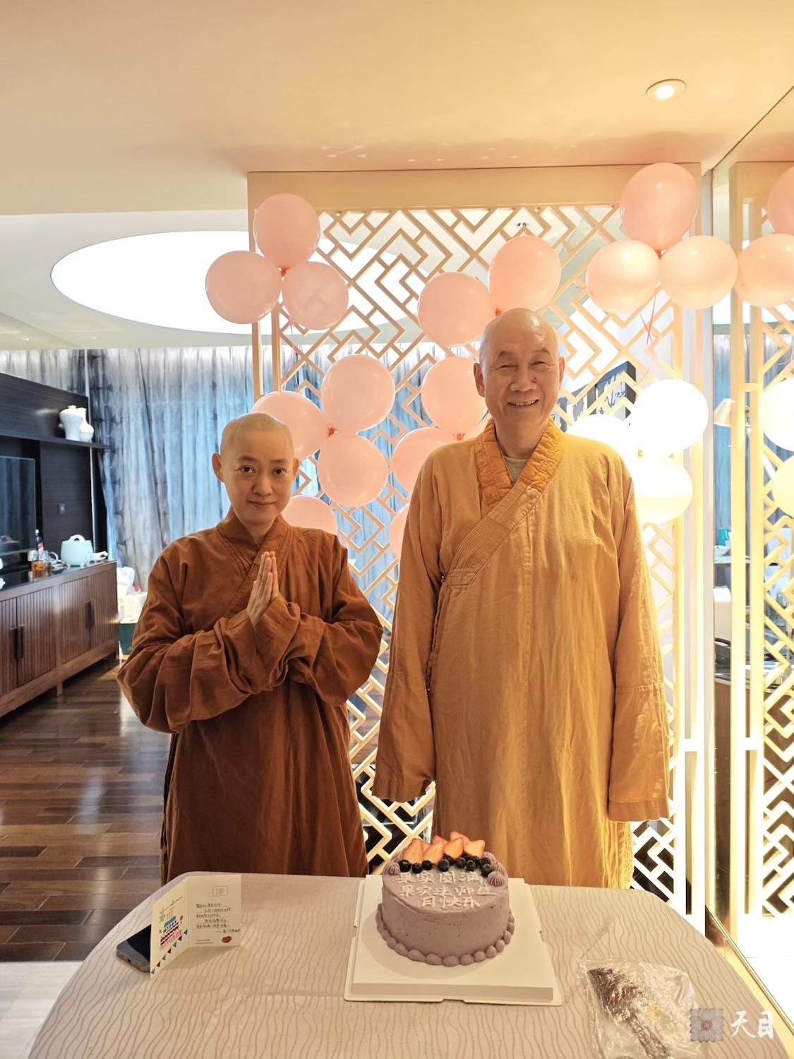 图一:恩师圣观法师和果实法师在厦门艾美高管菩萨们送来的纯净素生日蛋糕前合影;