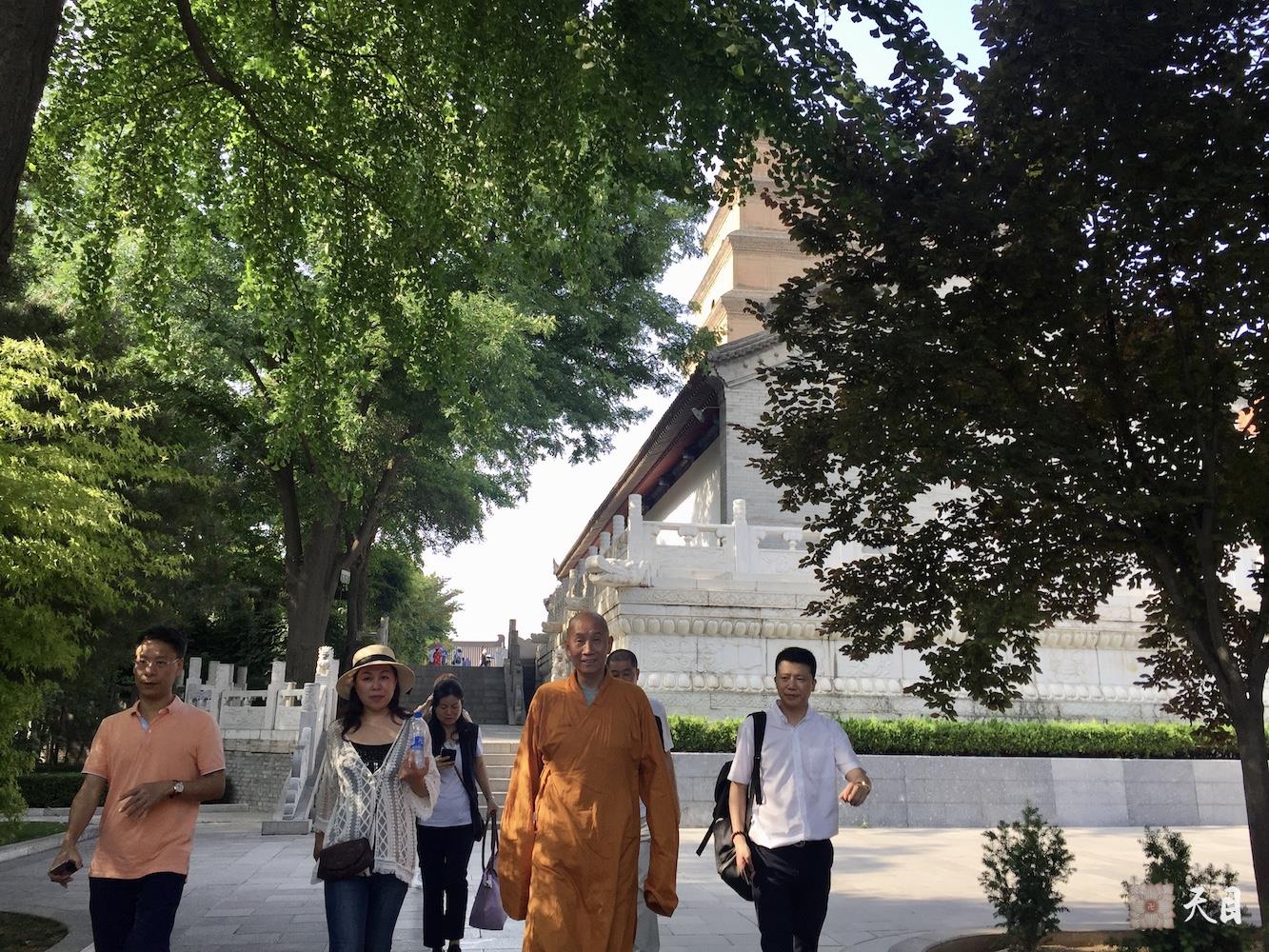 图为恩师圣观法师带领果实法师、常香法师、果然居士、常彩居士、果静居士、常信居士、心一居士、心敬居士等弟子在西安大慈恩寺参学以及瞻仰大雁塔的情景。