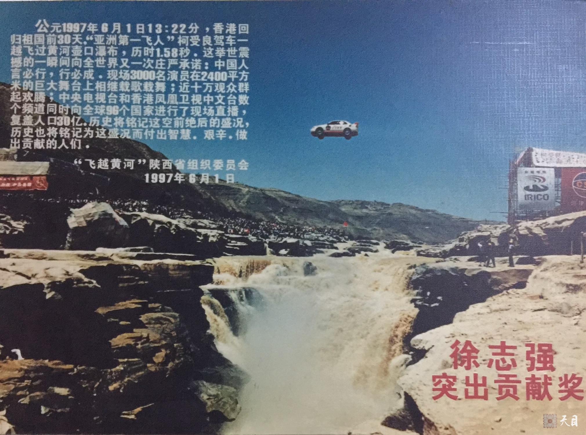 公元1997年6月1日13:22分,香港回归祖国前30天。“亚洲第一飞人”柯受良驾车一越飞过黄河壶口瀑布,历时1.58秒。这举世震撼的一瞬间向全世界又一次庄严承诺:中国人言必行,行必成。现场3000名演员在2400平方米的巨大舞台上相继载歌载舞;近十万观众群起欢腾;中央电视台和香港凤凰卫视中文台数个频道同时向全球96个国家进行了现场直播,覆盖人口30亿。历史将铭记为这盛况而付出智慧、艰辛、做出贡献的人们。