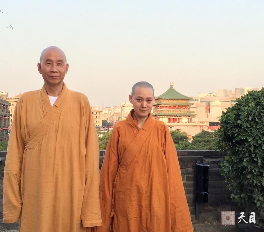 图为恩师圣观法师和果实法师在西安鼓楼的合影。