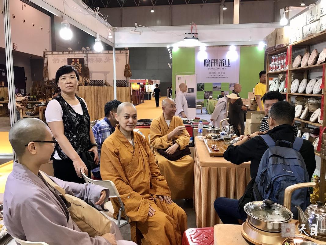 图为恩师圣观法师与果实法师等弟子在展会上品茶。