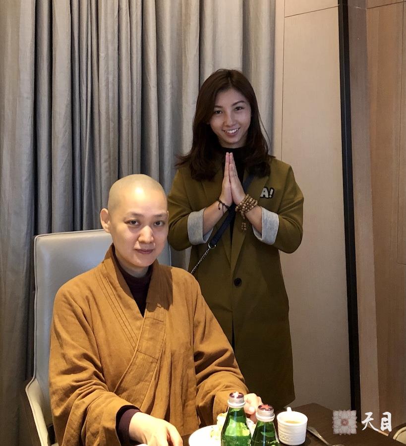 图为果实法师和常萍居士合影、果实法师在给恩师圣观法师祝寿前在海口万丽行政酒廊会议室留影。