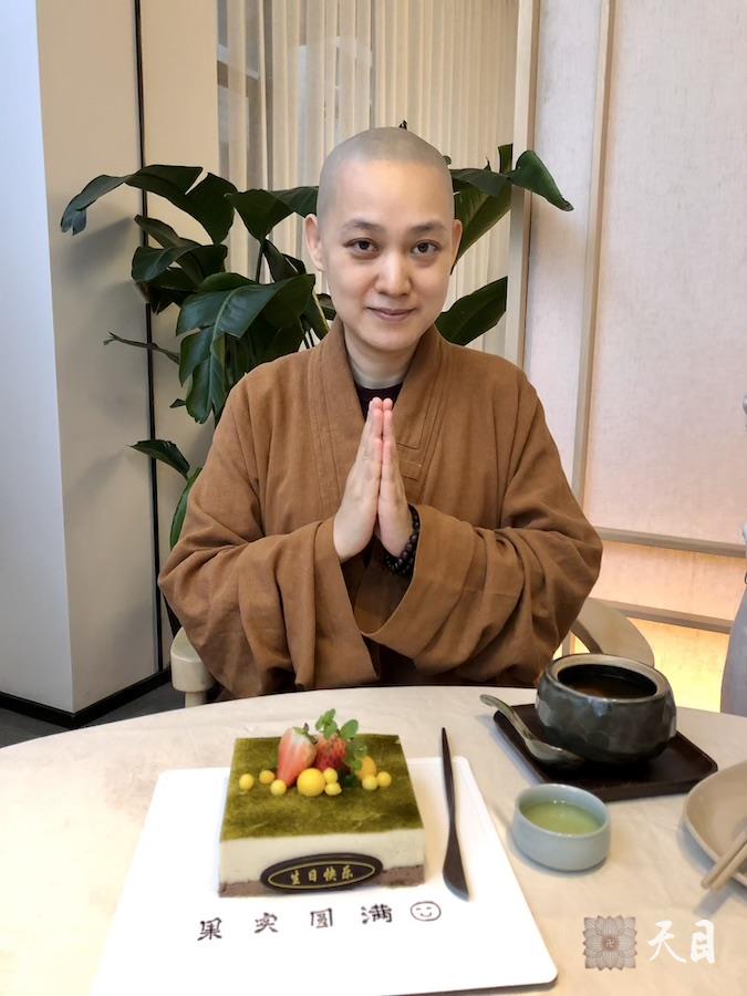 图为果实法师和生日净素蛋糕、以及海口700度素食馆黄玛丽居士供养的精美晚餐留影。
