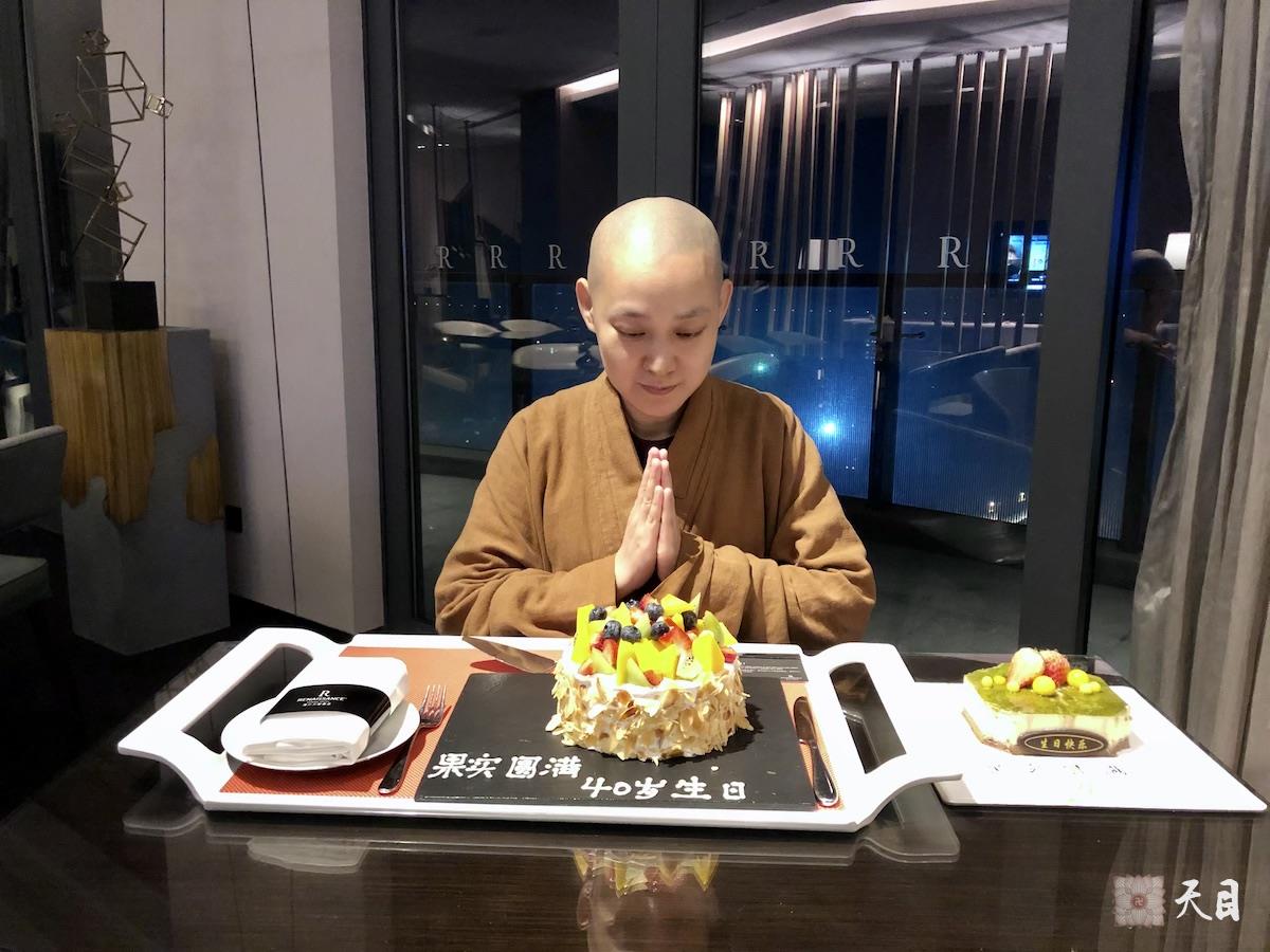 同时,海口万丽行政酒廊的常常居士、常乐居士已经准备好了海口万丽厨师团队制作赠送给果实法师精美的生日净素蛋糕,等着恩师圣观法师和果实法师回海口万丽行政酒廊庆祝。恩师圣观法师慈悲,在常萍居士的护持下,从海口700度素食馆回到海口万丽行政酒廊,继续加持果实法师生日!