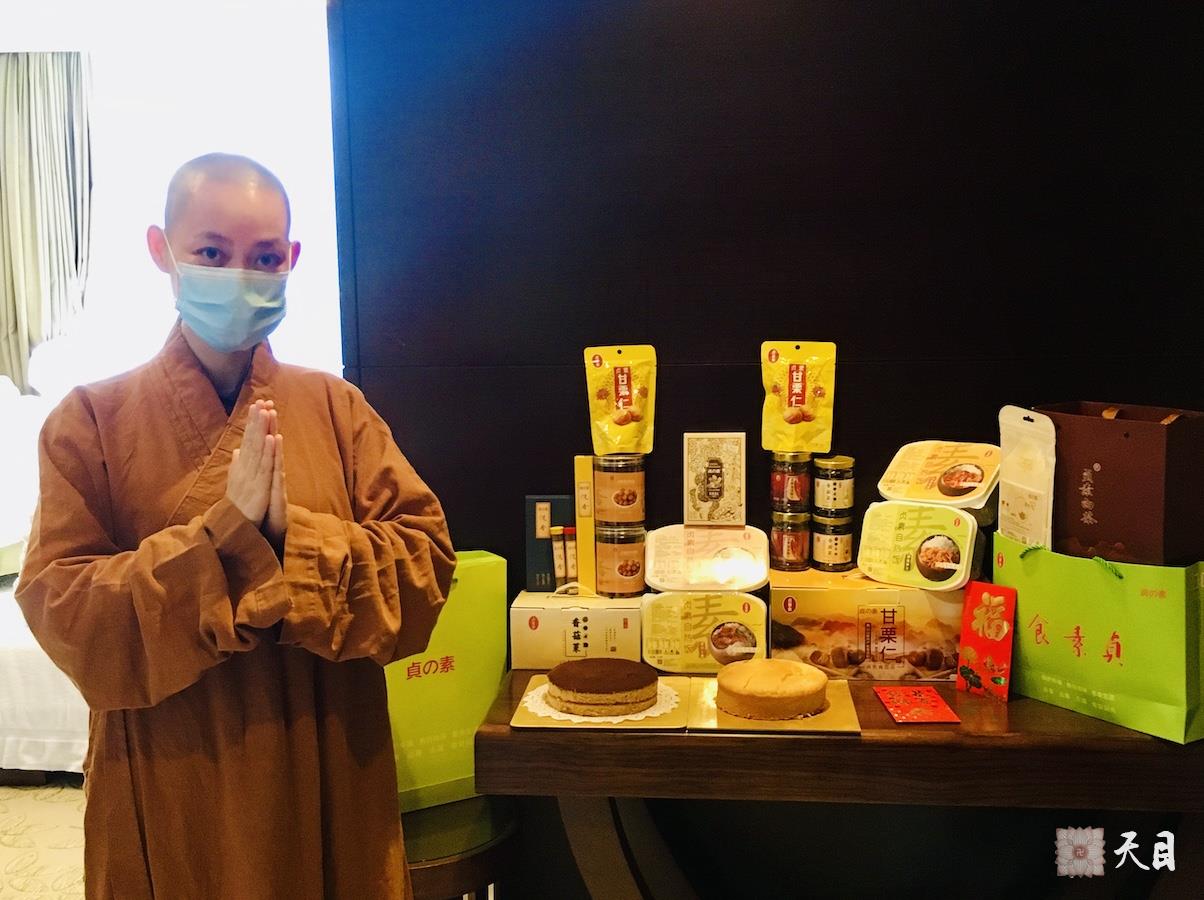 自从疫情爆发后,果实法师就随顺因缘闭关,2021年1月12日,是果实法师的生日,也是果实法师闭关的第358天。住在广州粤海喜来登道场3201房间的果实法师,为了更好地护持患有高血压、糖尿病、心脏病等基础疾病的恩师圣观法师,除了仅仅为给恩师圣观法师准备餐食才离开自己3201房间过去恩师圣观法师3216房间(恩师圣观法师3216房间有大厨房方便加热蒸煮消毒食物)外,果实法师没有去过其他地方,没有进过电梯,没有下过楼,一直处于闭关状态。到了两周前,恩师圣观法师生日,果实法师为给恩师圣观法师祝寿才首次和居士见面交流。今天,常彩菩萨和常芳菩萨前来给果实法师过生日,使果实法师3201这个闭关房在一年以来首次得以“开放”。由于疫情不仅没有结束,有些地方还出现反弹,传承恩师圣观法师的慈悲,为大家的安全着想,果实法师生日也不忘严格遵守社交距离,只在3201房间的门厅接受常彩居士和常芳居士的供养,并遵照恩师圣观法师的嘱咐,叫她们不要顶礼。然后,果实法师带领常彩居士和常芳居士来到3216房间拜见供养恩师圣观法师。一进门,果实法师就发现恩师圣观法师房间的门厅桌子上除了放着两个分别由广州粤海喜来登厨师团队制作赠送的和常耀居士供养的广州慧心素食出品的生日净素蛋糕外,还摆满了贞素产品。恩师圣观法师太慈悲了!总是不忘推广素食,保护环境,善待地球,念念相续、无有间断、身语意业、无有疲厌!