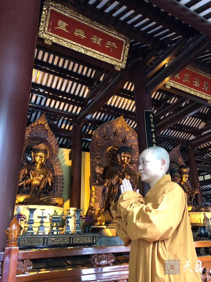 图为果实法师在大雄宝殿内礼佛绕佛。