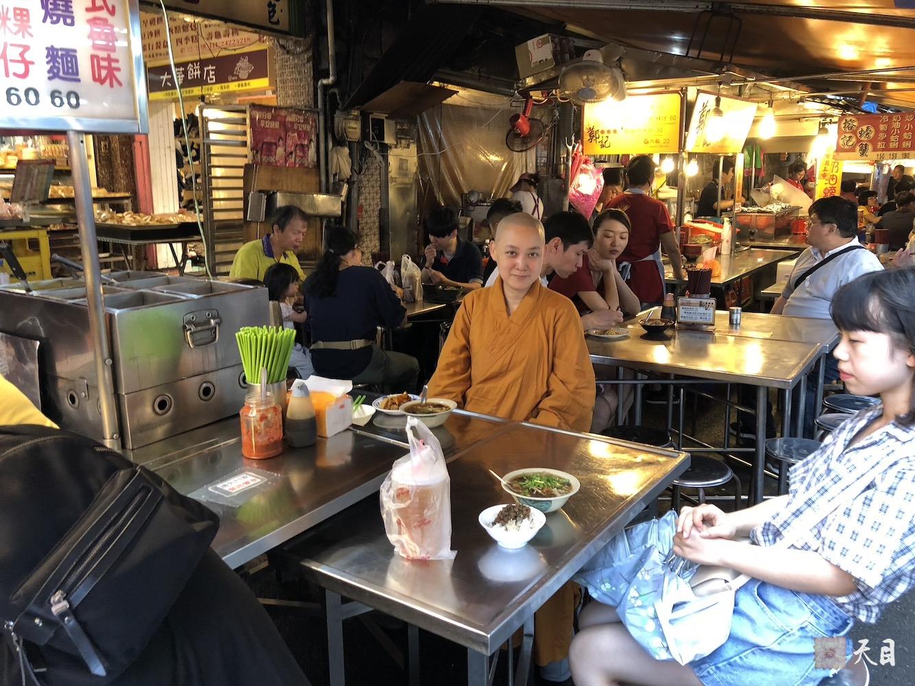 图为果实法师在基隆庙口的素食档口前,被丰富的品种及大排档形式的特色所深深吸引,就是眼大肚子小,好不容易才点好餐坐下,满满的成就感,非常开心。其实当时的天还一直下着小雨的,但是果实法师丝毫没有被影响,反而心情非常好,甚至忘记自己是一大早凌晨四点起床从西安乘座早班机赶来台北的。真心赞叹台湾的素食太发达太好了!