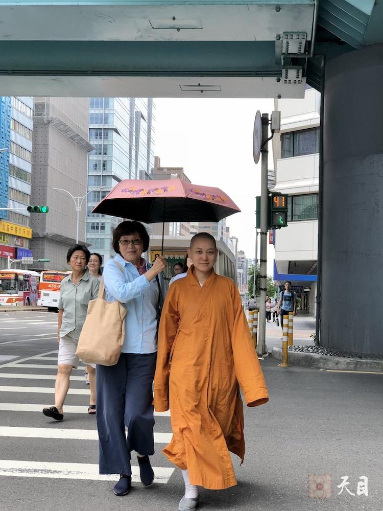 图为果实法师和果芳居士从台北六福皇宫威斯汀出发步行于复兴北路上在过红绿灯,心华居士说她看着果实法师在闹市中行走的场景,非常欢喜,就沿途即兴拍照,由此有了这些珍贵的记录。