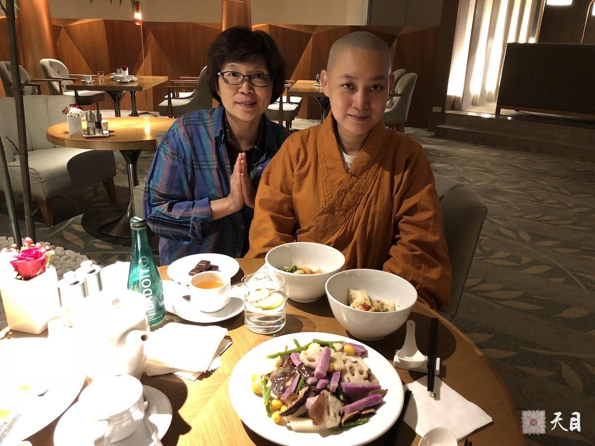 图一:果实法师和果芳居士在台南香格里拉豪华阁行政酒廊吃Biangbiang面前合影;