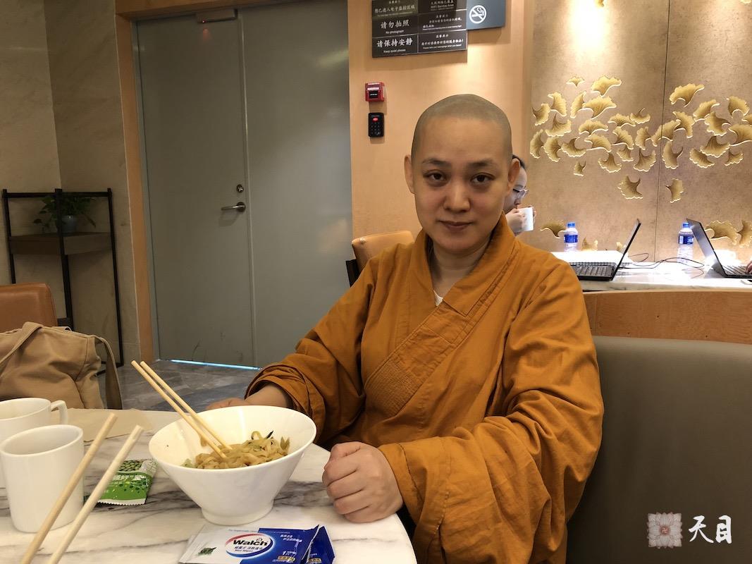 图为果实法师于航班起飞前在广州白云机场东航1号航站楼的东航休息室用餐。