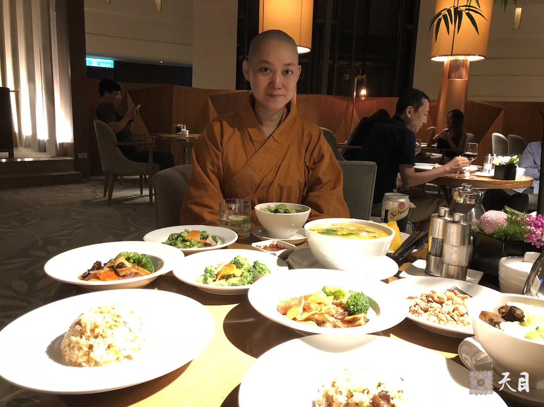 图为果实法师在台南香格里拉豪华阁行政酒廊晚餐前。