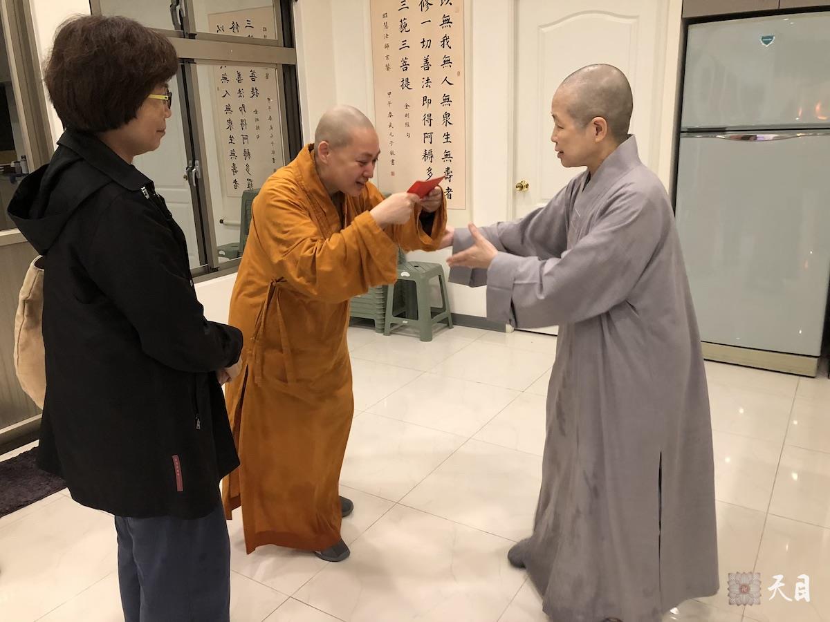 图为果实法师在佛教弘誓学院涅槃堂请求昭慧法师收下供养。