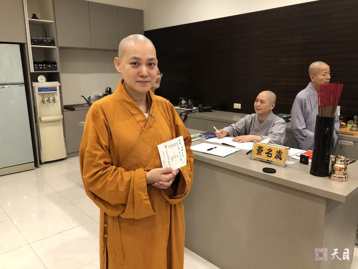 图为果实法师在佛教弘誓学院涅槃堂手持回执,看向昭慧法师。