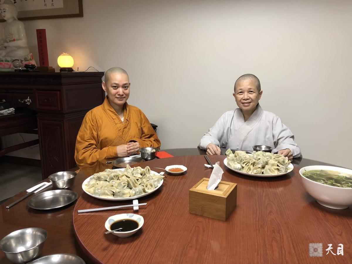 昭慧法师真的非常慈悲,特意让斋堂给果实法师、果芳居士、常富居士准备了果实法师最喜欢吃的饺子。昭慧法师一面是痛失母亲、要亲自料理丧事,一面是忙于接待十方前来吊唁的宾客,早已忙碌不堪,然而,仍等到这么晚也要坐下来陪同果实法师三人用餐,还无有疲厌地给大家开示。真的太受益!真的太感恩!昭慧法师的大丈夫风范!真的太让人敬佩!真的太让人赞叹!此次相聚,果实法师不哭了!真的太奇妙了!真的太法喜!