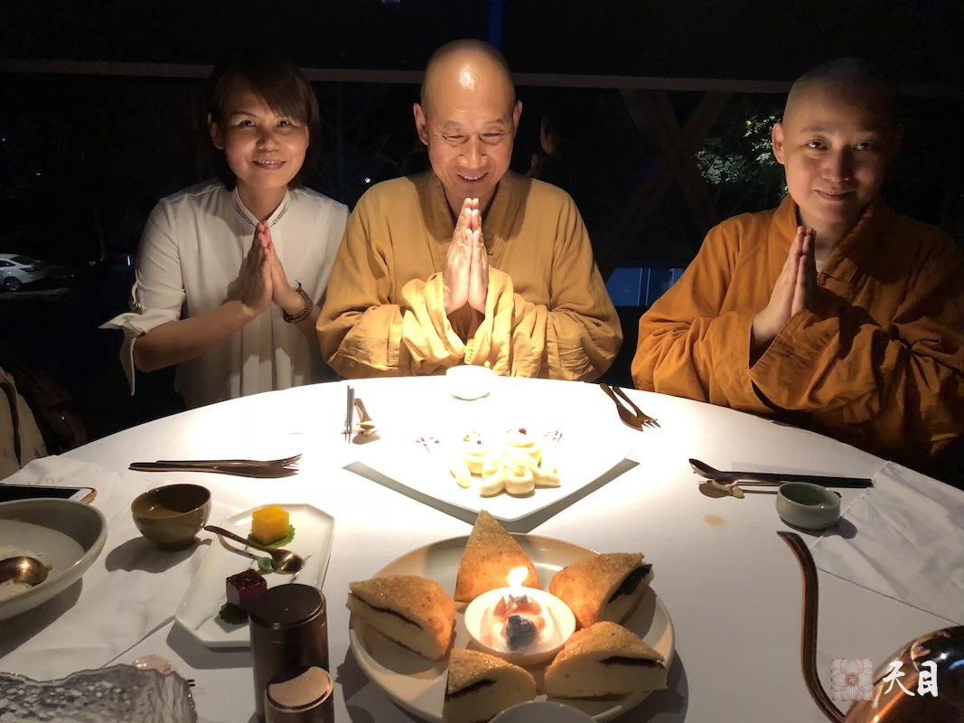 2018年8月31日,恩师圣观法师带领果实法师在西安美儒居士的荷·上乘舒食空间素食馆给常彩居士庆祝生日,美儒居士特意给常彩居士准备了 “ 阿弥陀佛!” 寿糕,并且和闺蜜一起来给恩师圣观法师泡茶,听恩师圣观法师开示:“ 我们学佛的好处,是 ‘得与如是诸上善人聚会一处’ 。” (此处收录于视频,网站格式受限暂时无法展示。)