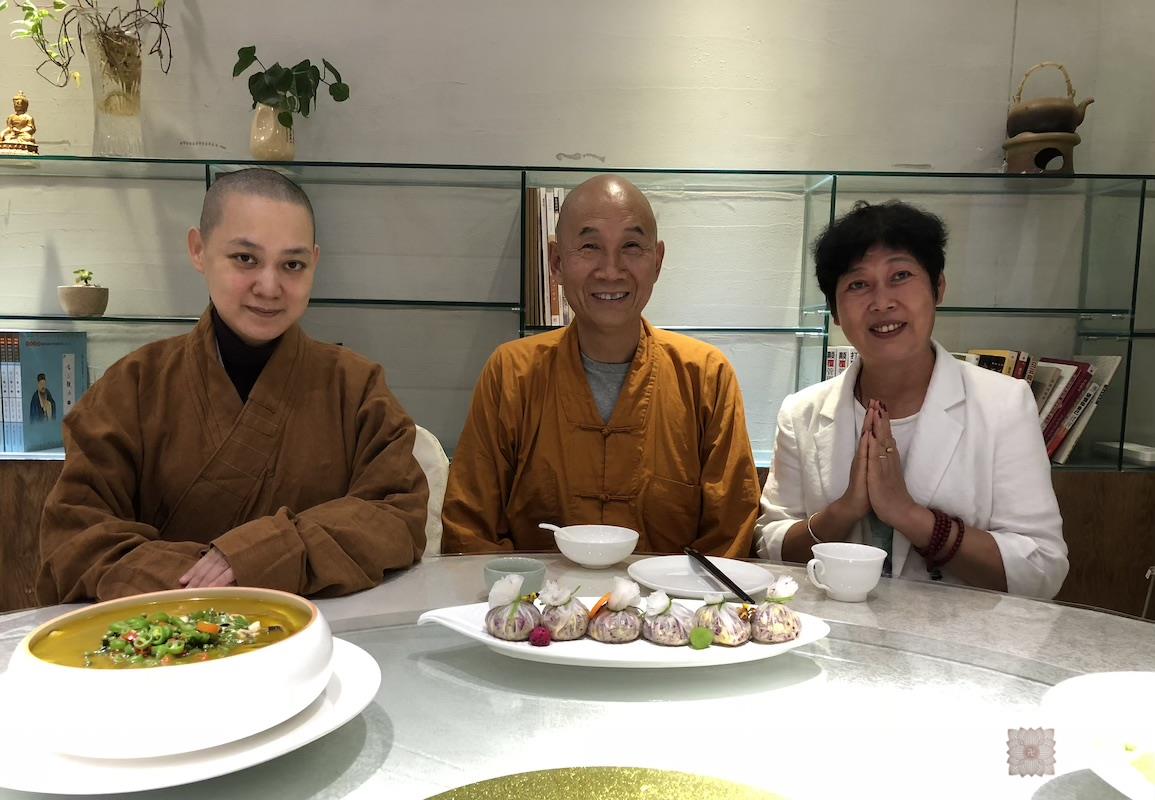 图为恩师圣观法师和果实法师、常好居士在西安天素无界素食馆合影。