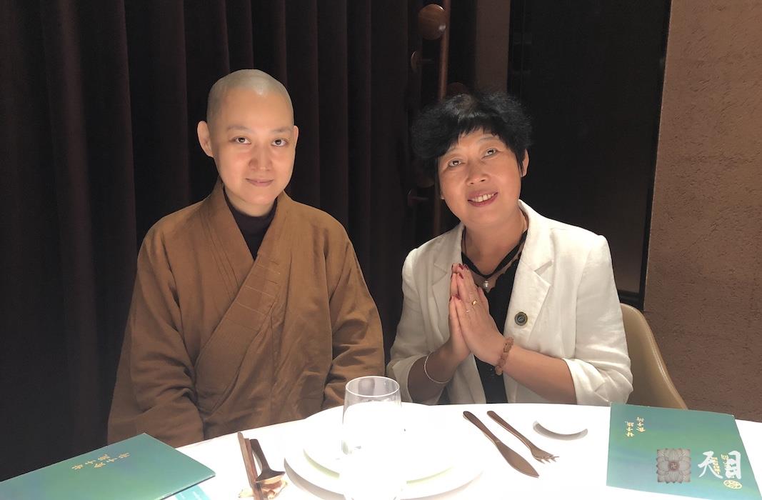 图为果实法师和常好居士在西安荷·上乘舒食空间素食馆合影。