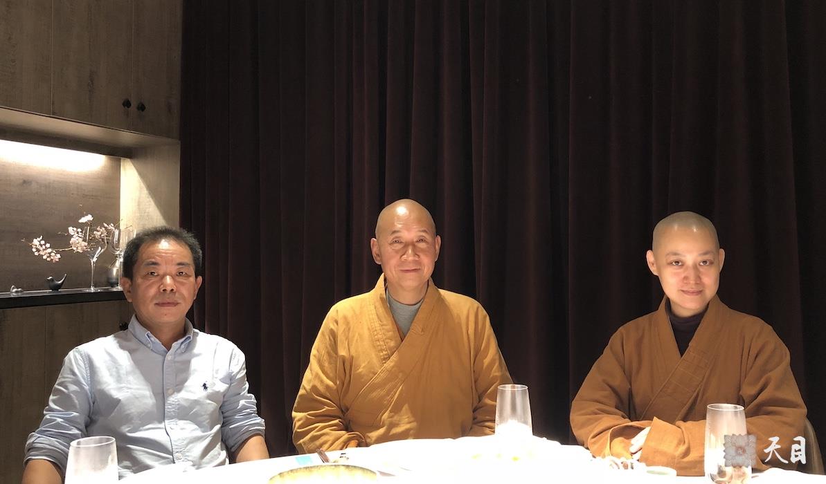 图为恩师圣观法师和果实法师、常悟居士在西安荷·上乘舒食空间素食馆合影。