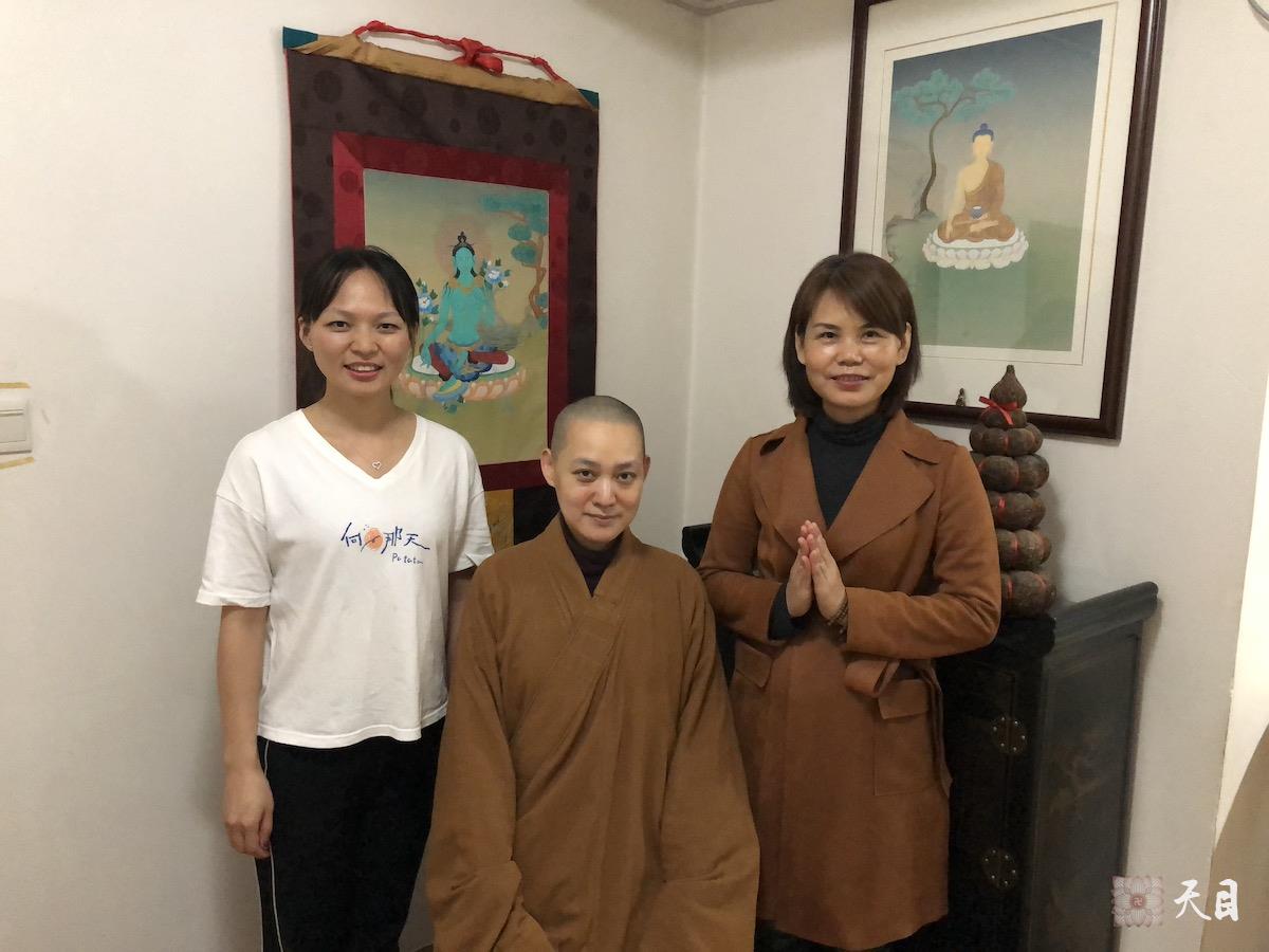 图为果实法师和常云居士、常彩居士在西安佛堂释尊唐卡、绿度母唐卡以及阿慧居士供养的坝糯藤条老古树茶生普前合影。