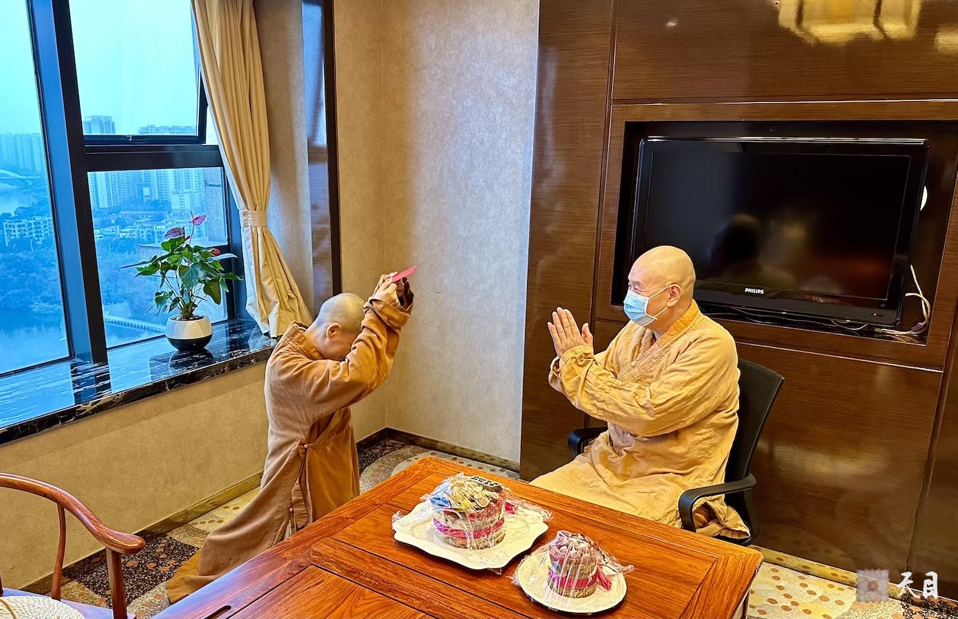 恩师圣观法师太慈悲了!恩师圣观法师应果实法师的礼请,在中山喜来登行政酒廊会议室加持果实法师生日,与众菩萨一起给果实法师庆祝生日。在这里,非常感谢中山喜来登道场的高管菩萨们特意在迎接恩师圣观法师和果实法师返回前两个月,把行政酒廊的会议室改造成一个中式茶室,墙上挂着一副有达摩祖师像的《心经》字画,俨然禅茶一味的佛教氛围!同时,也要特别感谢常金居士数月来的护持供养。2023年10月7日,常金居士专程从义乌坐飞机到西安,次日即2023年10月8日,开房车到西安赛瑞喜来登道场护持恩师圣观法师和果实法师把资料搬回西安佛堂、到恩师圣观法师在西安最早的住所中国兵器工业第二0三研究所(简称203所)、跟随恩师圣观法师到草堂寺。2023年10月9日,恩师圣观法师和果实法师在常金居士的护持下离开西安赛瑞喜来登道场南下,经过洛阳、开封、合肥,回到恩师圣观法师的母校中国科学技术大学,最终到达义乌香格里拉道场。五十天后,即2023年12月2日,恩师圣观法师和果实法师在常金居士的护持下,乘坐房车继续南下,途经温州、厦门、汕头,最终到达光之翼深圳JW万豪道场。观察数日后,常金居士眼看恩师圣观法师因身体仍然无法承受飞机出行,而不得不取消海南三亚海口的行程,就主动请示果实法师,继续留下来,先后驾驶施总提供的奥迪A8和徐加健居士提供的保姆车,把恩师圣观法师和果实法师的大部分行李分两次提前运输到中山喜来登道场。在2023年12月18日,恩师圣观法师和果实法师在常金居士的护持下,乘坐徐加健居士提供的保姆车回到中山喜来登道场,最终落地中山喜来登道场过冬。常金居士护持恩师圣观法师和果实法师在中山喜来登道场彻底安顿好后,才放心在冬至的前一天即2023年12月21日返回义务。又迫于时间紧迫错过了恩师圣观法师2023年12月29日的生日而难以释怀,常金居士发愿在自己农历生日即2024年1月11日又是果实法师2024年1月12日生日的前一天,赶到中山喜来登拜见亲近供养恩师圣观法师和果实法师,在果实法师的生日当天即2024年1月12日,跟随恩师圣观法师和其他菩萨一起给果实法师送上至诚祝福。