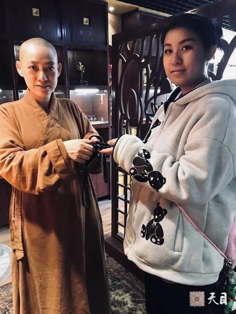 图为果实法师在给大家开示时和常静居士的朋友吴灏翎合影。