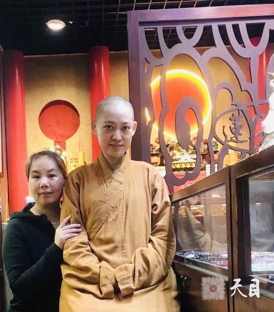 图为果实法师在莲花地佛教珍宝主题文化店和常静居士合影。