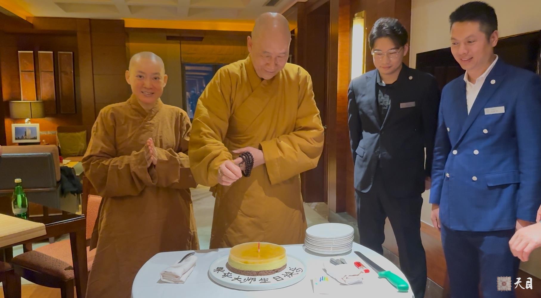 图为恩师圣观法师在果实法师把生日素蛋糕上的蜡烛吹灭后准备给果实法师切生日素蛋糕。