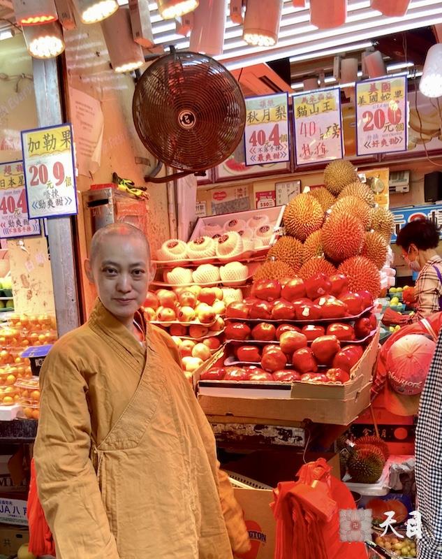 图为果实法师在香港应常青居士供养宝莲苑素食馆后,果实法师在西环老街区的猫山王榴莲水果档口前留影,此时常青居士正给果实法师现场挑选供养猫山王榴莲。照片由常顺居士拍摄。