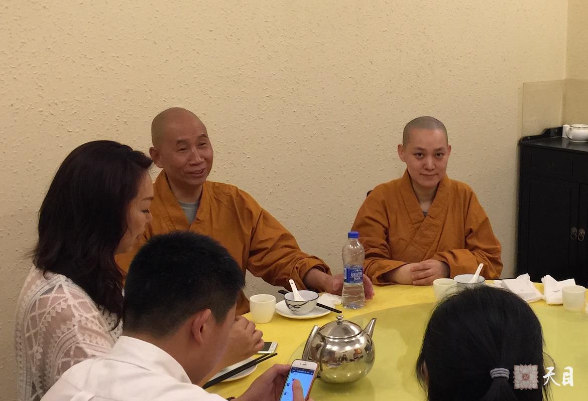 图为恩师圣观法师在大兴善寺的天龙宝严素食馆用餐时,给果实法师、常香法师、果然居士、果静居士、常信居士、心一居士、心敬居士等弟子开示。