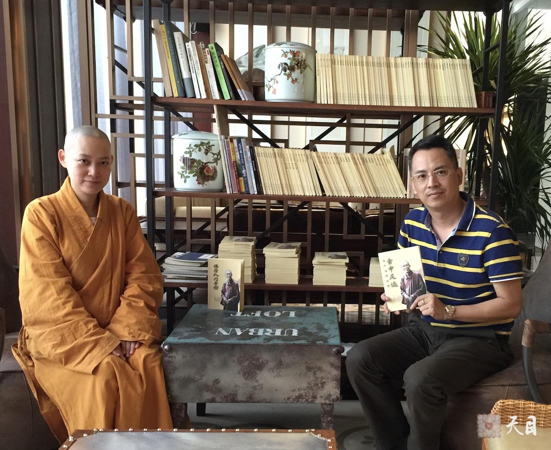图为果实法师和心宁居士在恩师圣观法师加持果实法师倡印的圣严法师法宝前合影。