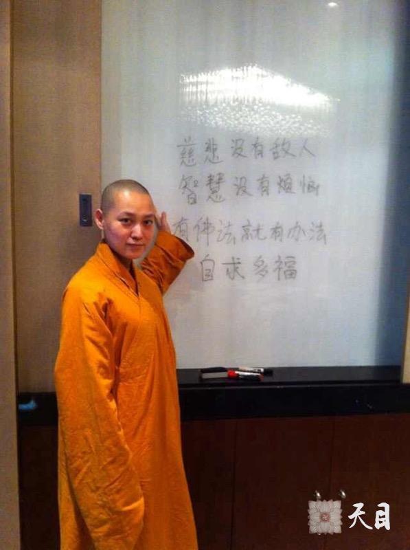 20140803果实法师在深圳弘法期间,在深圳福田香格里拉豪华阁会议室给信众开示,“慈悲没有敌人,智慧没有烦恼”、“有佛法就有办法”、“自求多福”,常香法师做侍者。