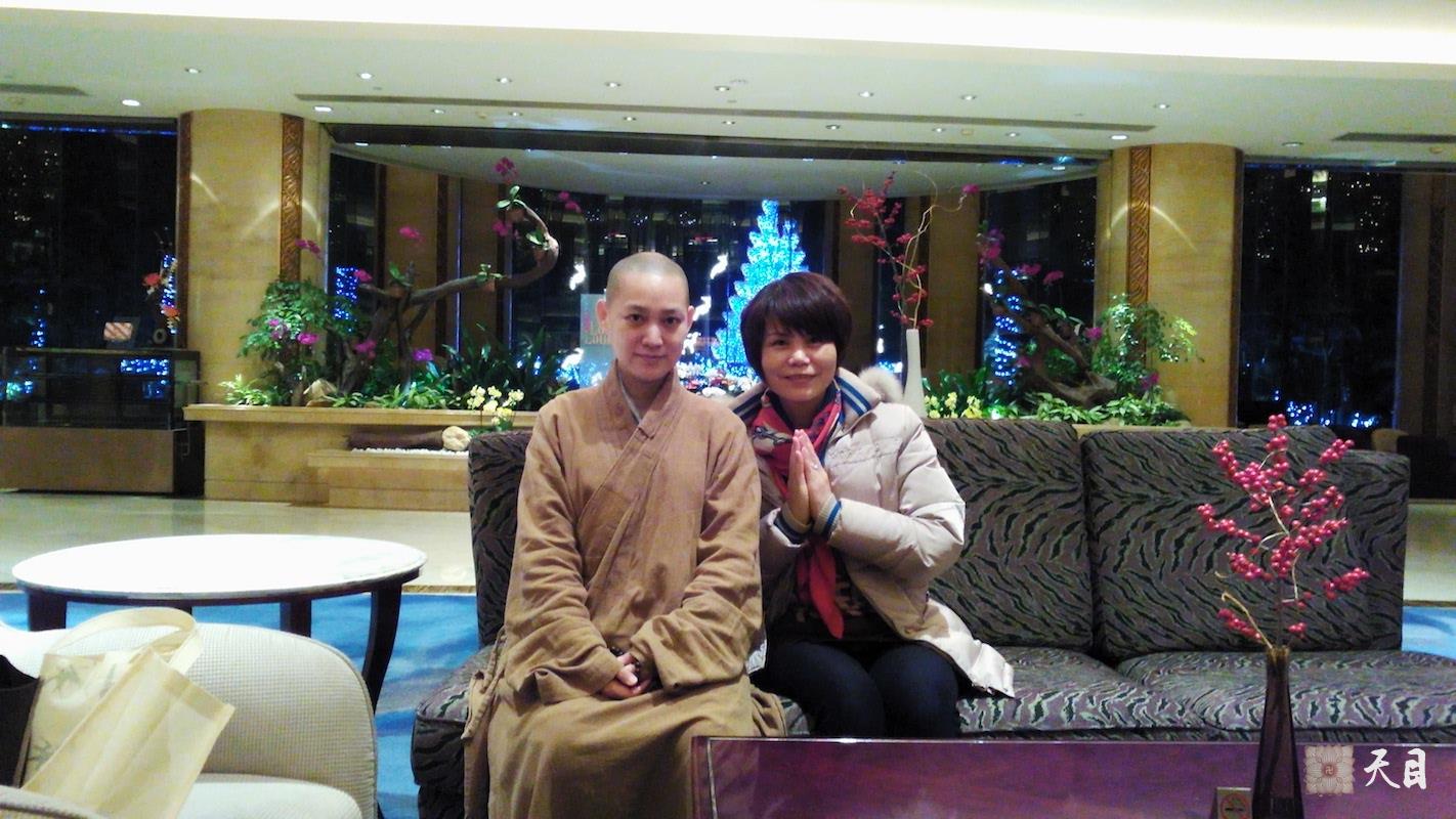 20141217、25果实法师在广州弘法期间,和常彩居士、常柔居士在广州香格里拉合影,一起给恩师圣观法师祈福。
