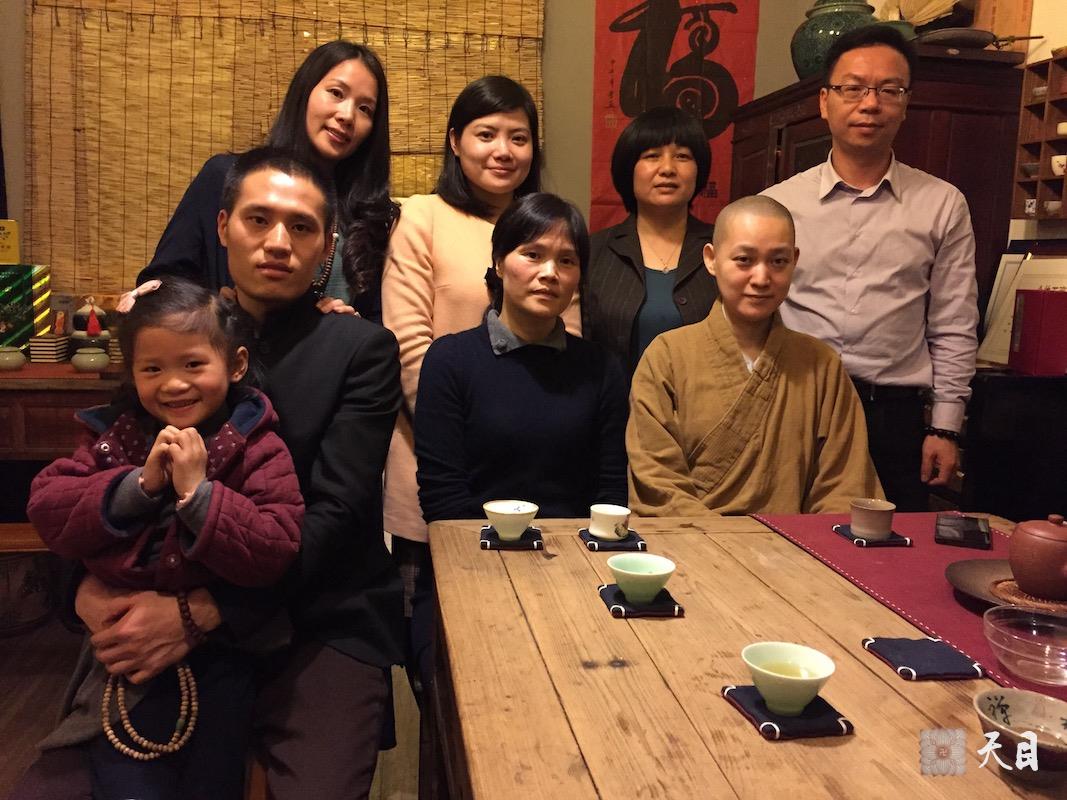 图为果实法师和常顺居士阿龙夫妇、常见居士谢芳可乐一家、常珍居士、常泰居士在常顺阁茶行的合影。